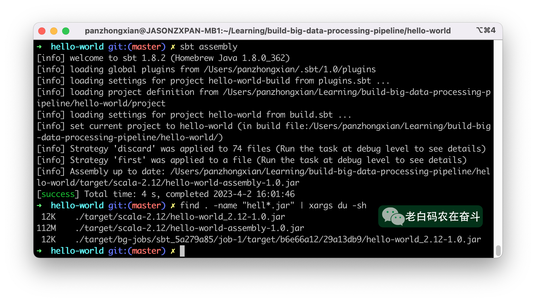 这样之后会得到一个完整的包,路径类似于“./target/scala-2.12/hello-world-assembly-1.0.jar”,可以看到单独的 jar 文件是12K,完整的包则是 112M。