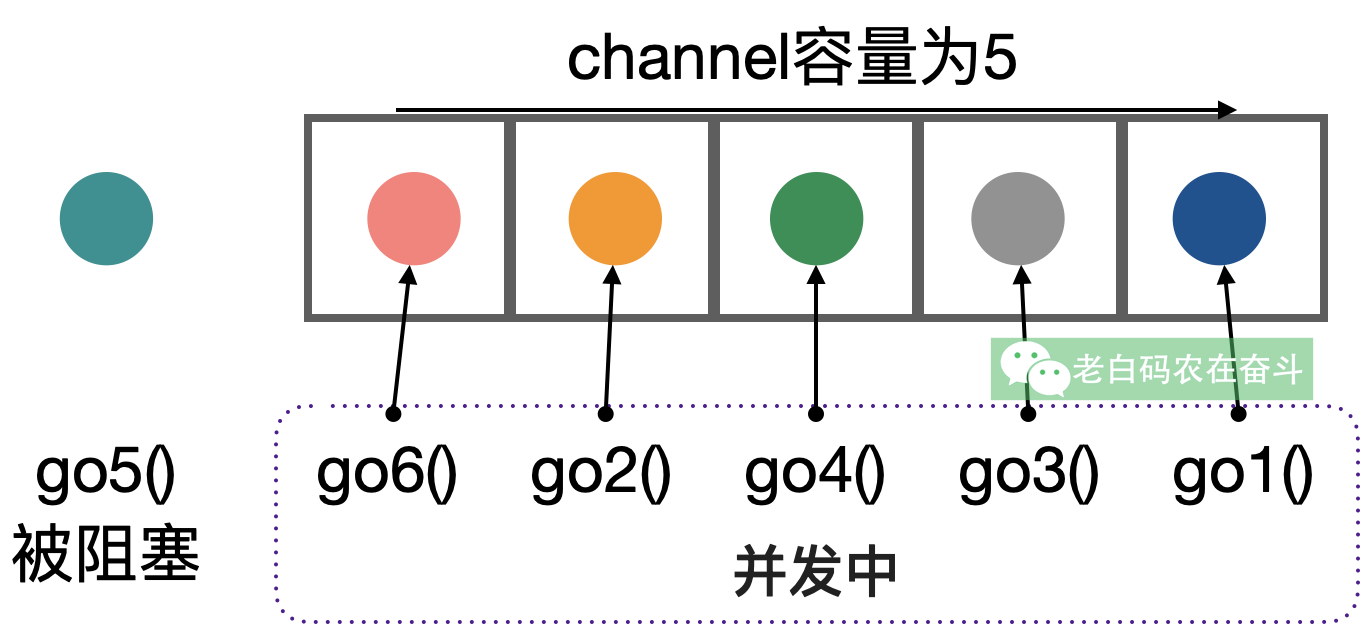 使用通道容量控制并发数,非常典型。经过通道的元素总数数对应于总的需要处理的次数,而通道容量则对应并发的最大数量。通过往通道发送获取信号量,从通道接收来释放信号量。